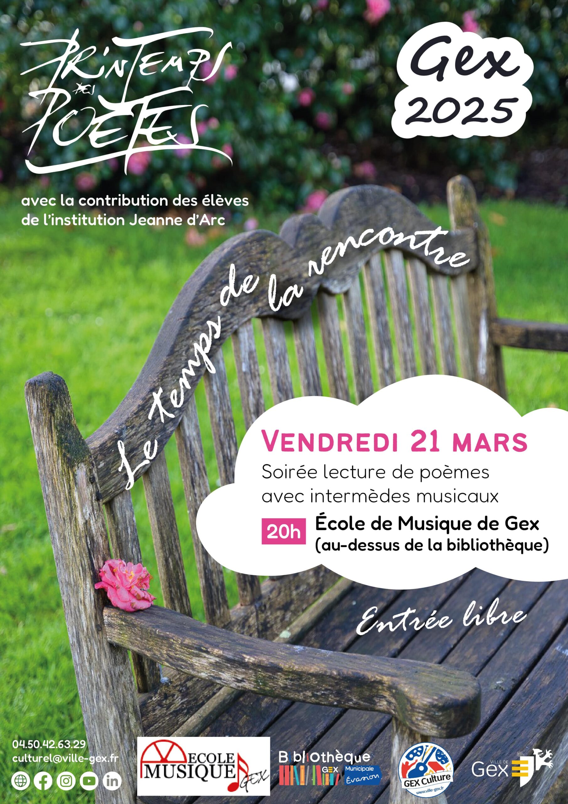 Dans le cadre de l’évènement national Le Printemps des Poètes, le service culturel en partenariat avec la bibliothèque Évasion et l’École de musique organise un évènement :
