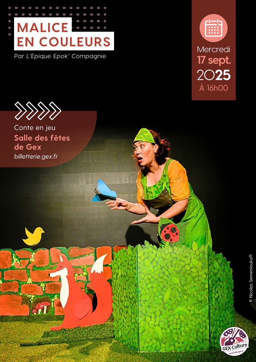 Salle des fêtes 77 rue de l'horloge, Gex, FranceChauffez vos voix et vos petites mains, Malice aura sans aucun doute besoin de vous ! Malice en couleurs Conte en jeu Mercredi 17 septembre 2025 De 16h à 16h30 A partir de 18 mois Salle des fêtes, 01170 GEX Elle, c'est Louisette la conteuse et elle, c'est Malice, son personnage, petite fille bavarde et…