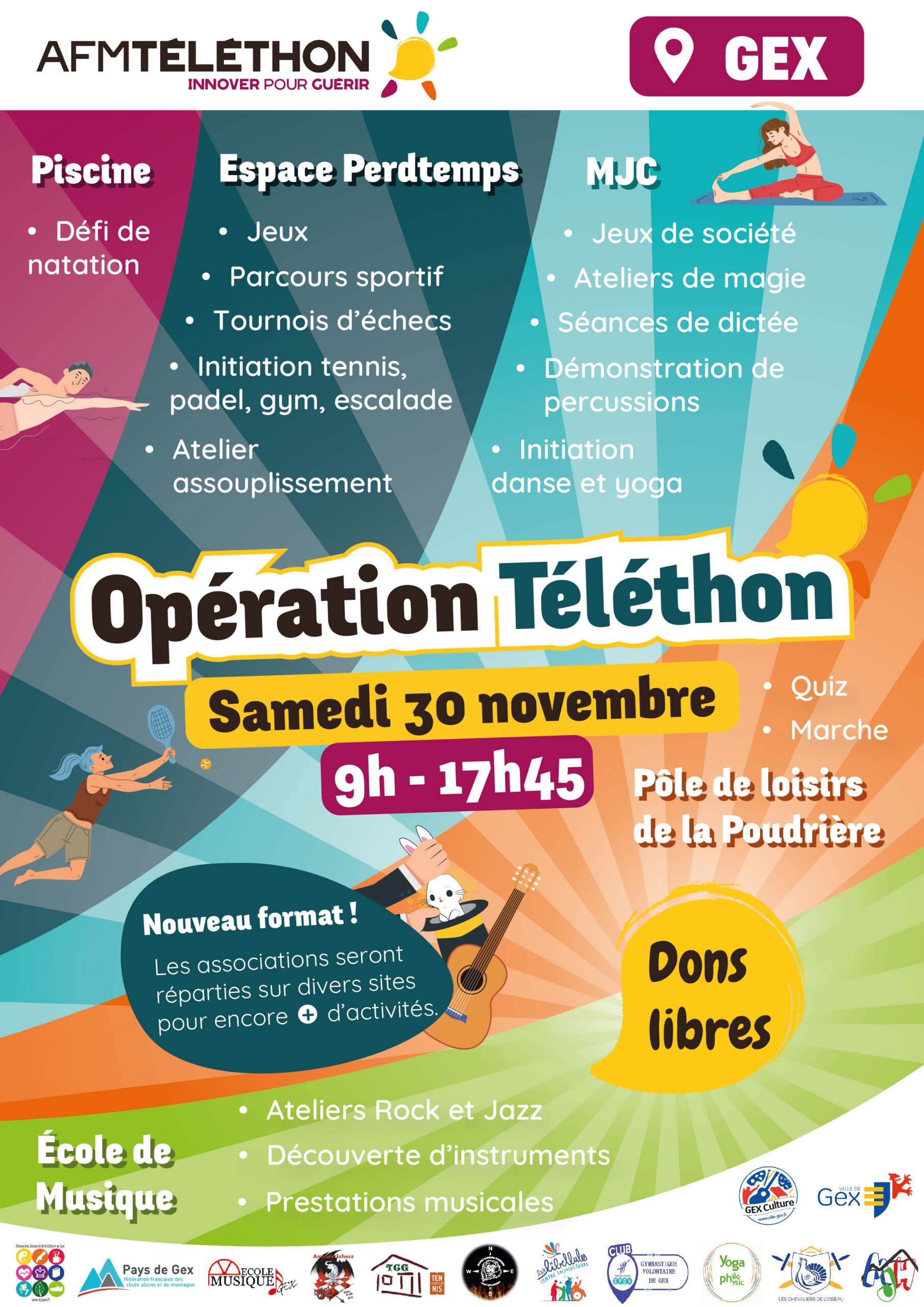 Espace Perdtemps - Halle Avenue Perdtemps, Gex, FranceLa Ville et les associations renouvellent leur soutien à l'AFM Téléthon avec : L'opération Téléthon Samedi 30 novembre 2024 De 10h00 à 16h00 Cette année, le service culturel propose un changement de formule pour cette nouvelle édition du Téléthon. Les associations seront présentes sur plusieurs lieux d’activité et des cartes à cases seront en…