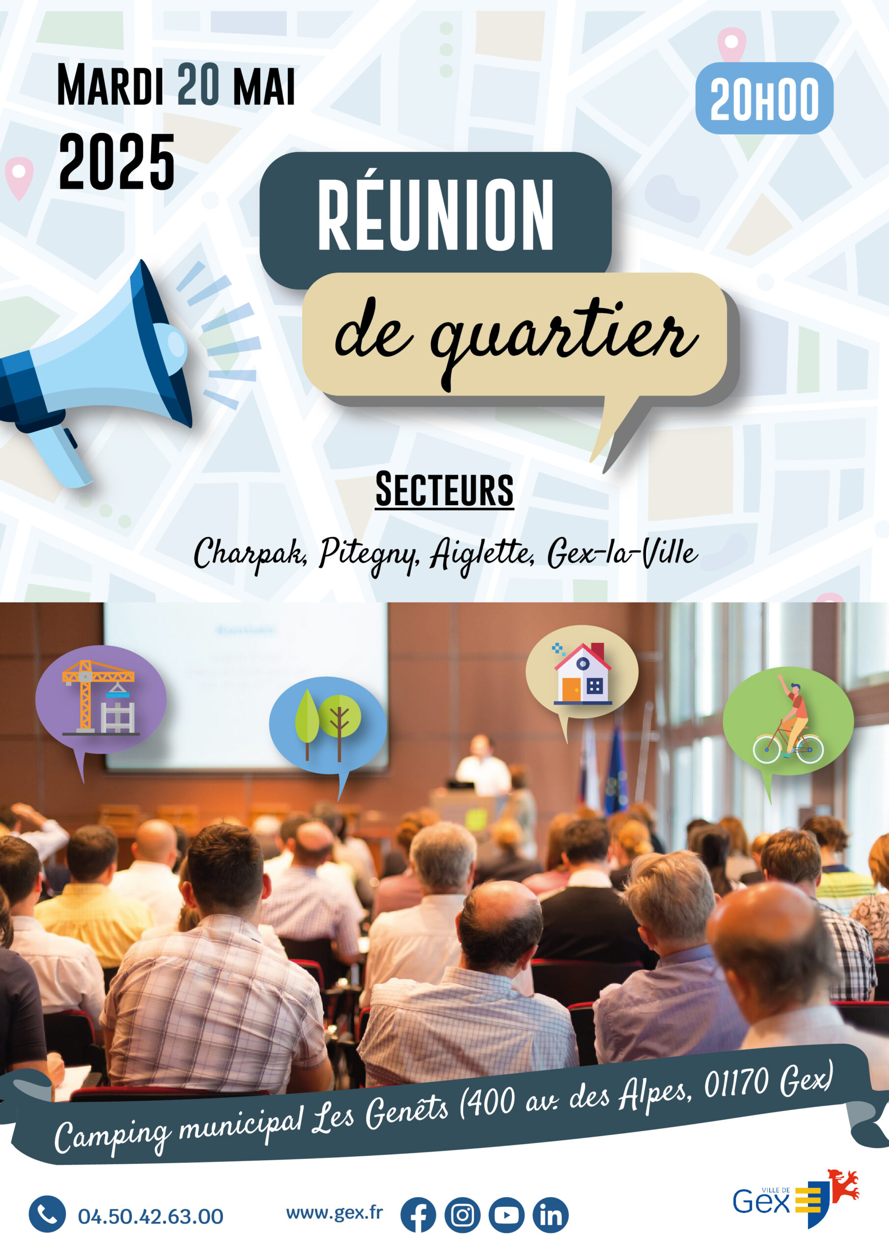 La Ville est heureuse d’organiser une nouvelle réunion publique, à destination des habitant(e)s des secteurs Charpak / Pitegny / Aiglette / Gex-la-Ville. Réunion publique secteurs Charpak / Pitegny / Aiglette / Gex-la-Ville Mardi 20 mai 2025 20h00 Camping municipal Les Genêts 400 av. des Alpes Cette réunion est ouverte à tous et constitue l’occasion…
