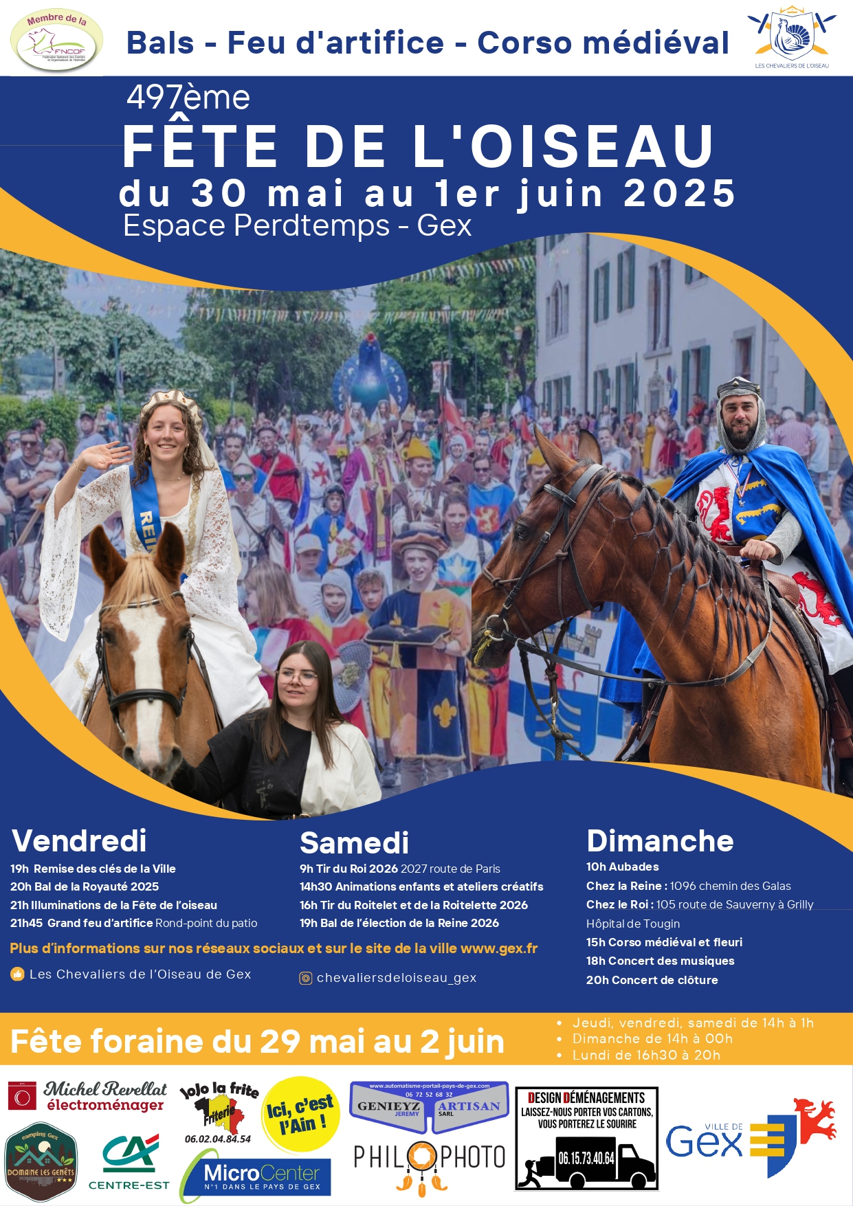 La Ville de Gex se prépare à accueillir l’emblématique Fête de l’Oiseau qui fera son grand retour au printemps pour une nouvelle édition ! 🎉 497e Fête de l'Oiseau 🎉 Du jeudi 29 mai au lundi 2 juin 2025 Centre-ville Organisé par le comité des Chevaliers de l’Oiseau de Gex, en partenariat avec…