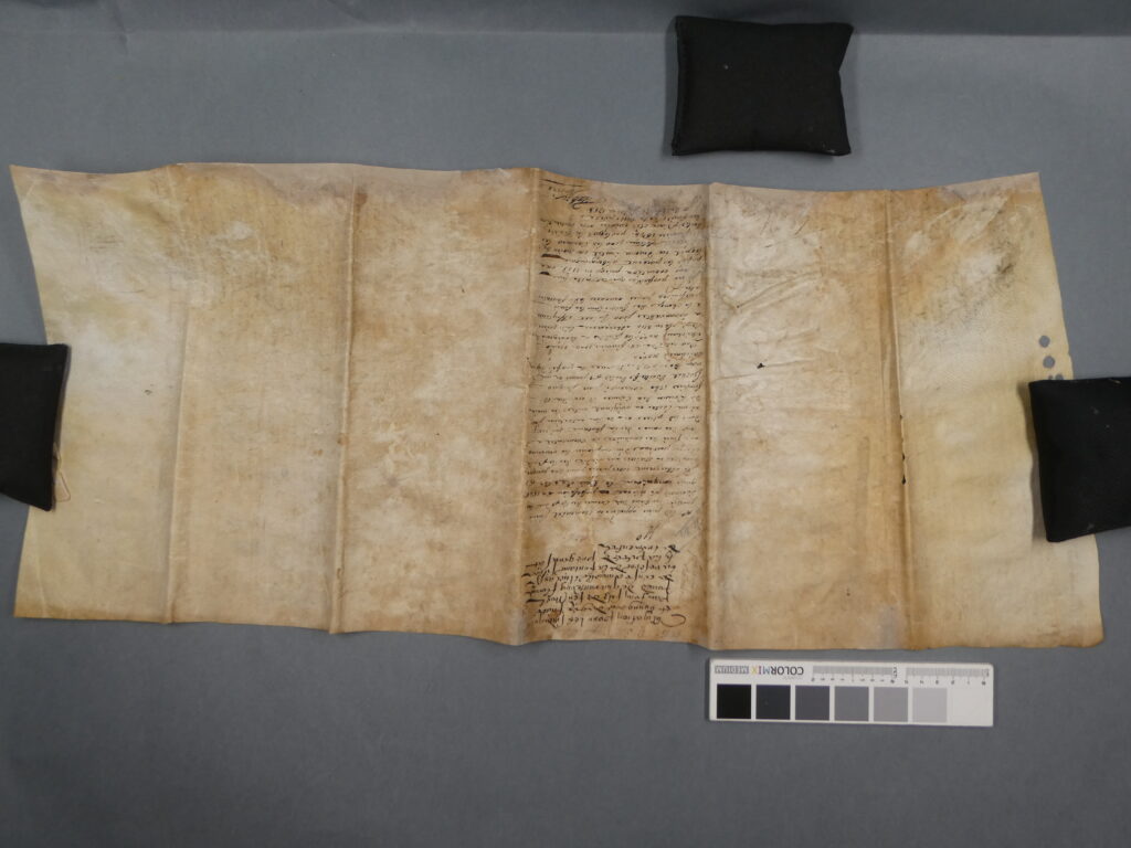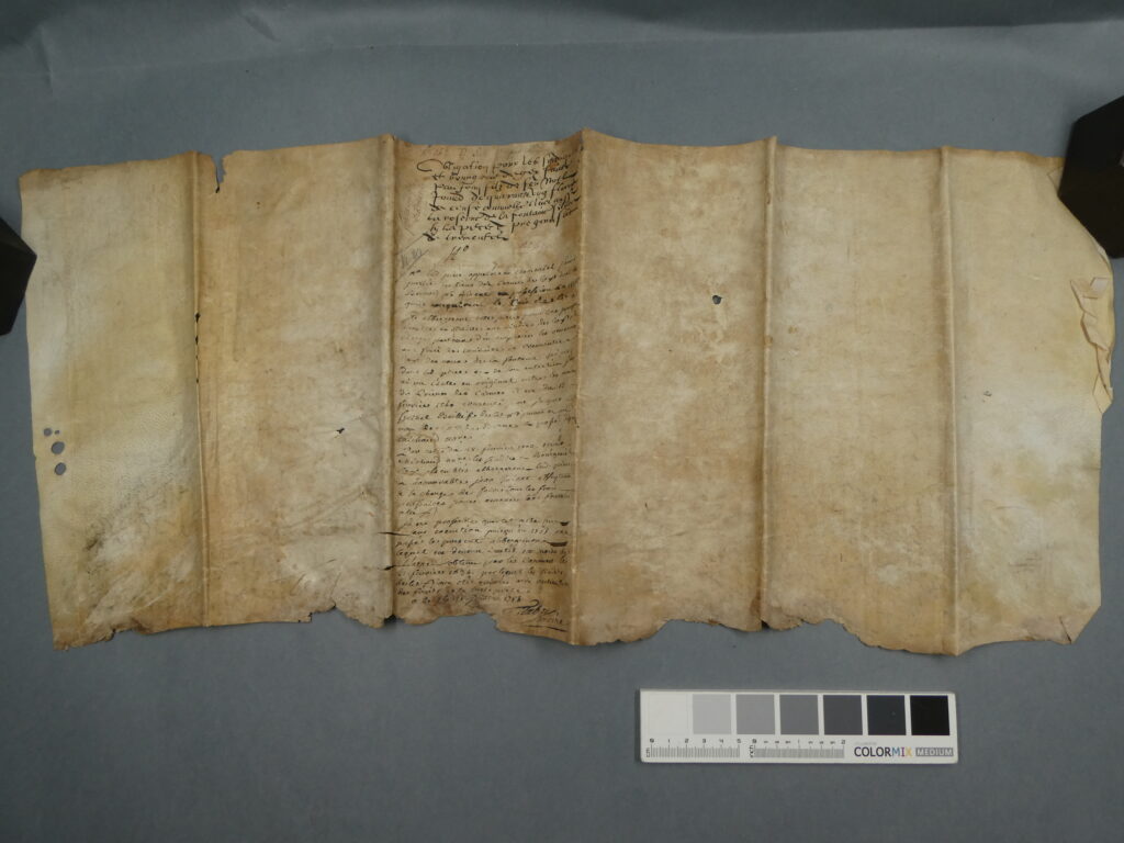 • Parchemin en peau animale – 1608 – acte de vente d’une maison en vue d’y installer l’horloge