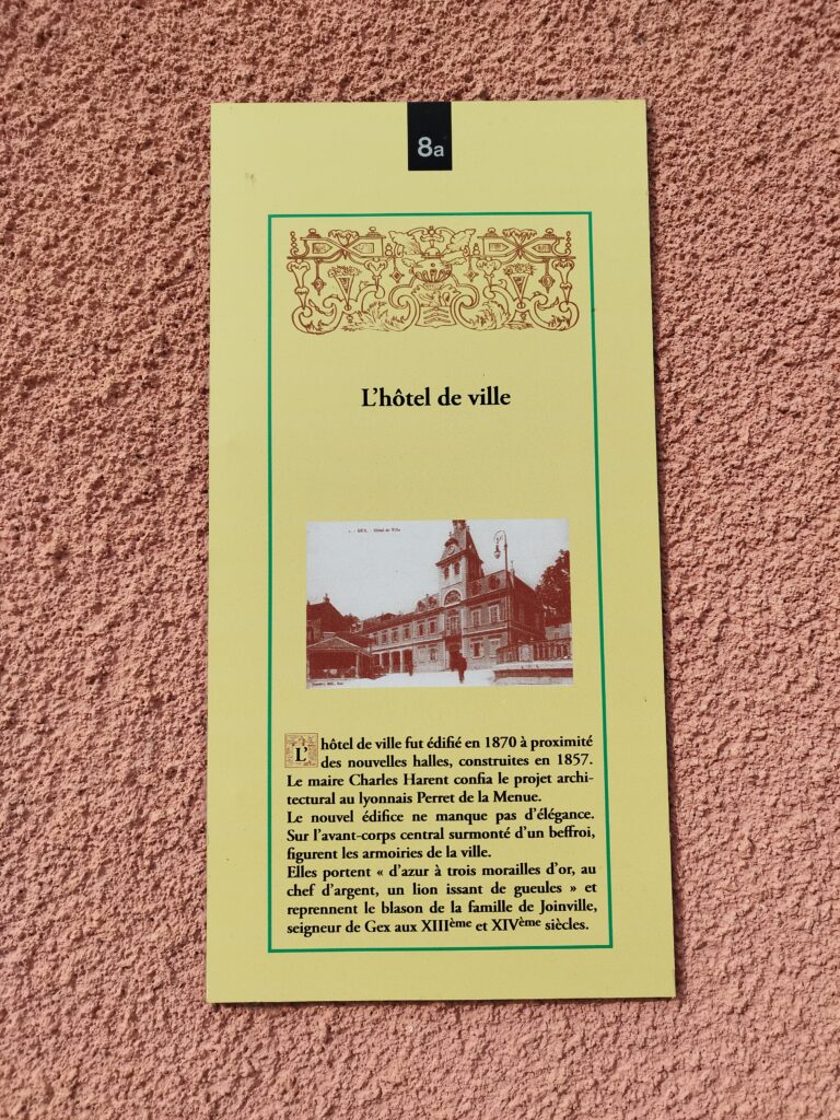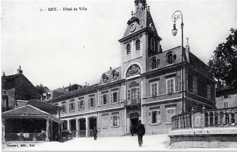 L’hôtel de ville fut édifié en 1870 à proximité des nouvelles halles, construites en 1857. Le maire Charles Harent confia le projet architectural au lyonnais Perret de la Menue. Le nouvel édifice ne manque pas d’élégance. Sur l’avant du corps central surmonté d’un beffroi, figurent les armoiries de la ville. Elles portent « d’azur à trois morailles d’or, au chef d’argent, un lion issant de gueules » et reprennent le blason de la famille de Joinville, seigneur de Gex aux XIIIème et XIVème siècles.